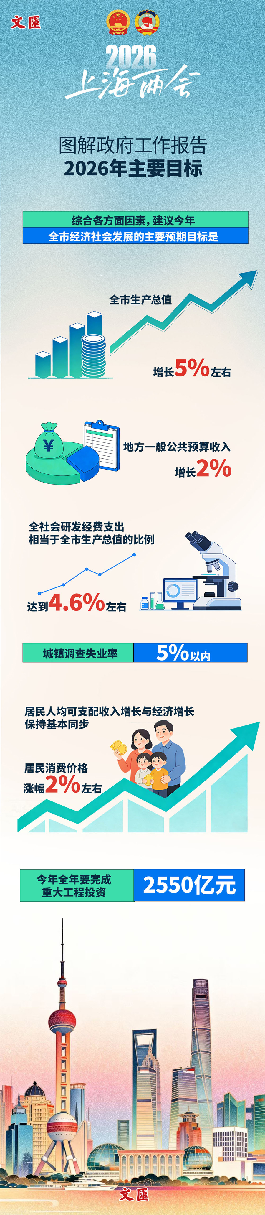 龚正说,综合各方面因素,建议今年全市经济社会发展的主要预期目标是:全市生产总值增长5%左右,地方一般公共预算收入增长2%,全社会研发经费支出相当于全市生产总值的比例达到4.6%左右,城镇调查失业率5%以内,居民人均可支配收入增长与经济增长保持基本同步,居民消费价格涨幅2%左右。