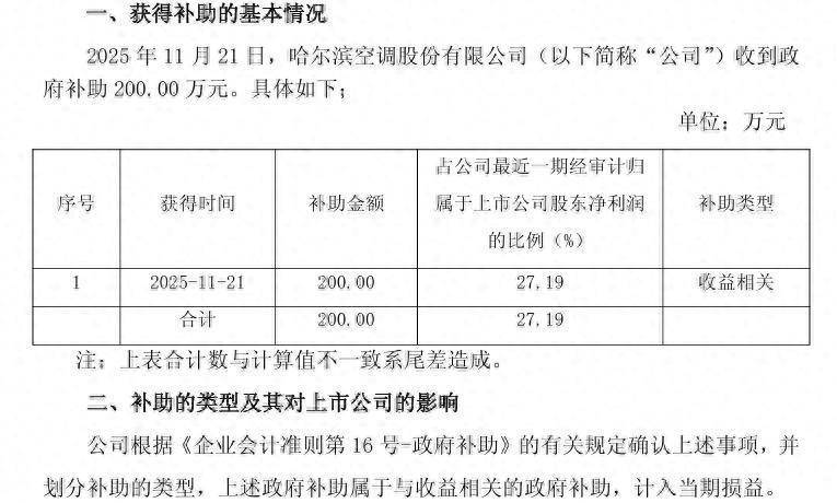 11月21日,哈空调(600202)发布公告,公司于2025年11月21日收到政府补助200万元,该补助金额占公司最近一期经审计归母净利润的27.19%。此次政府补助被划分为与收益相关的类型,计入当期损益。